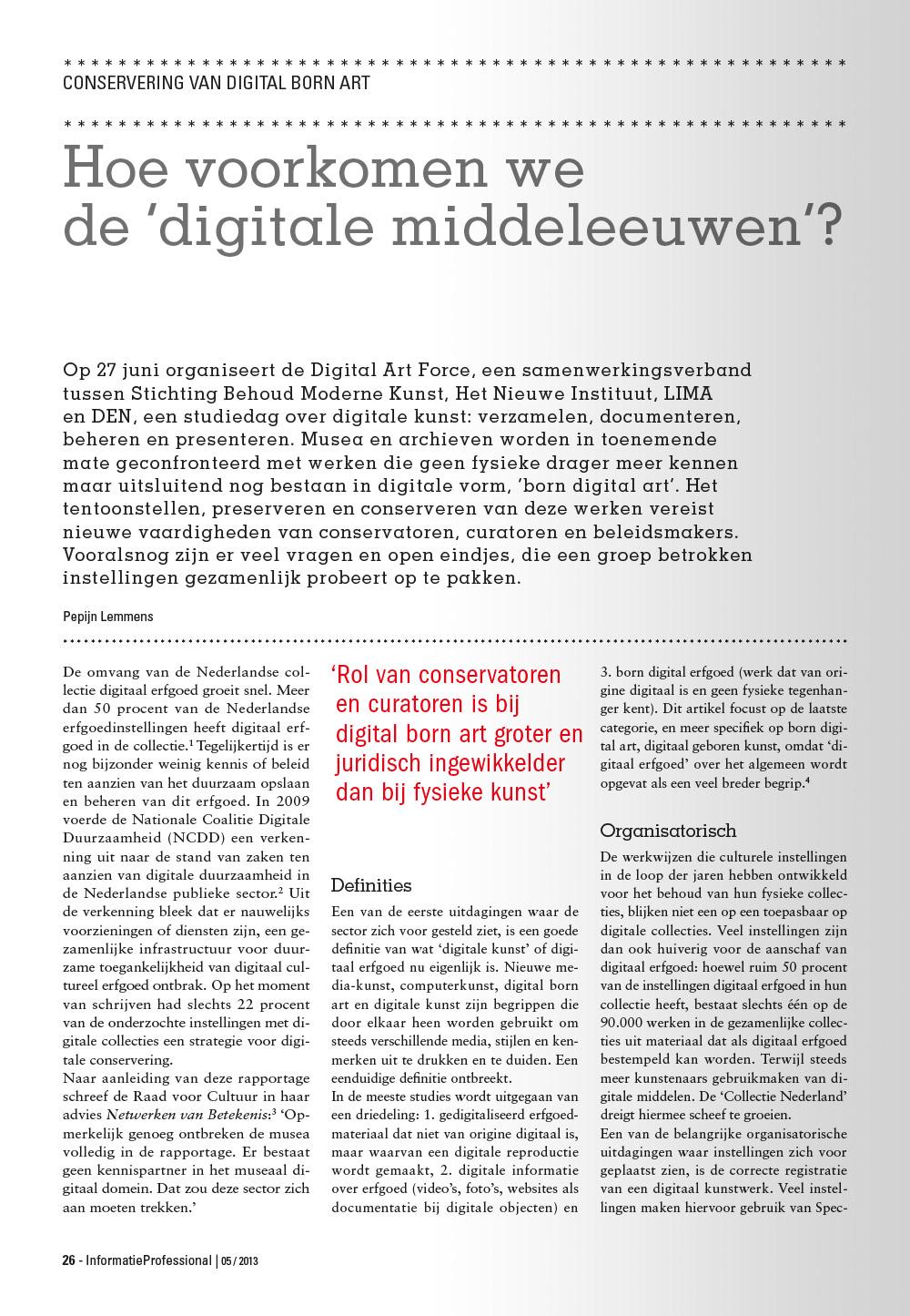 In de InformatieProfessional van de maand juni 2013 staat een artikel naar aanleiding van de studie dag ‘Join the Digital Art Force!’.